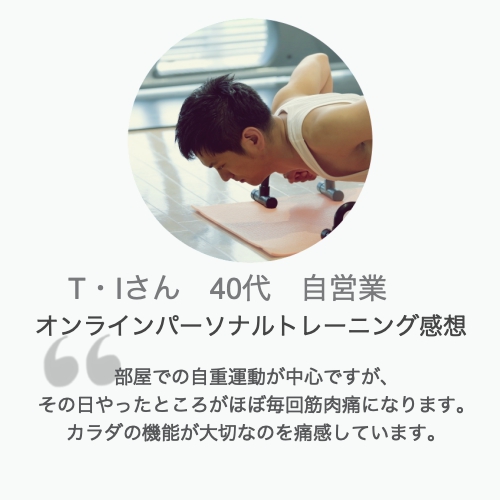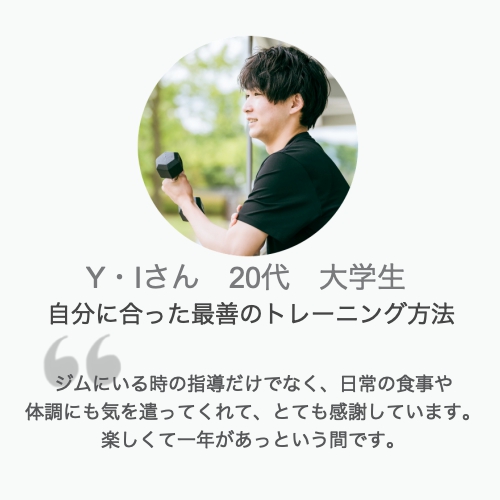 ※この感想を頂いた後、Iさんはさらにトレーニングを重ねて遂にはパーソナルトレーナー資格の取得にまで至り、大学卒業後の現在はフィットネス業界に就職なさいました。